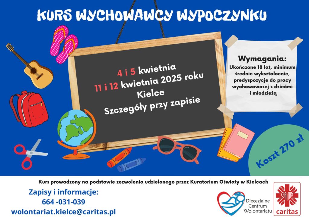 Caritas Diecezji Kieleckiej zaprasza na „Kurs wychowawcy wypoczynku”. Jego ukończenie uprawnia do pełnienia funkcji wychowawcy podczas kolonii, obozów, zimowisk, oaz itp. Kurs odbędzie się w dniach 4, 5 kwietnia (piątek, sobota) i 11, 12 kwietnia 2025 (piątek, sobota) w Centrum Integracji Społecznej w Kielcach przy ul. Wesołej.